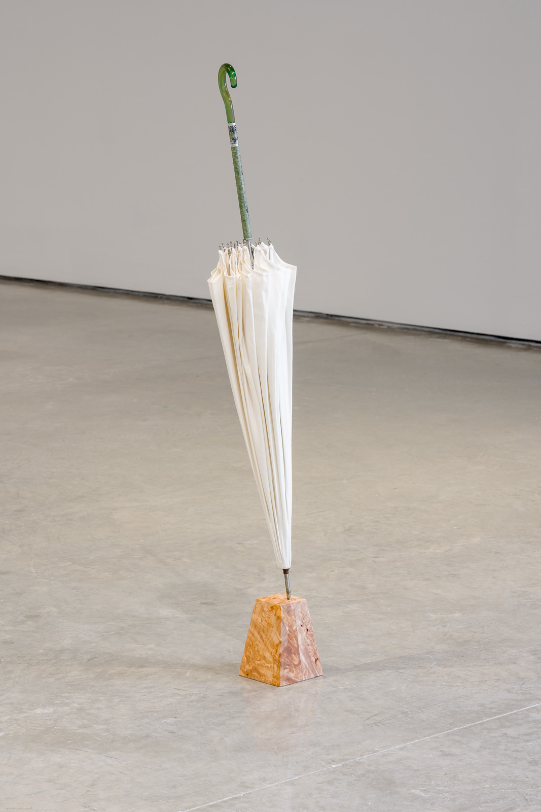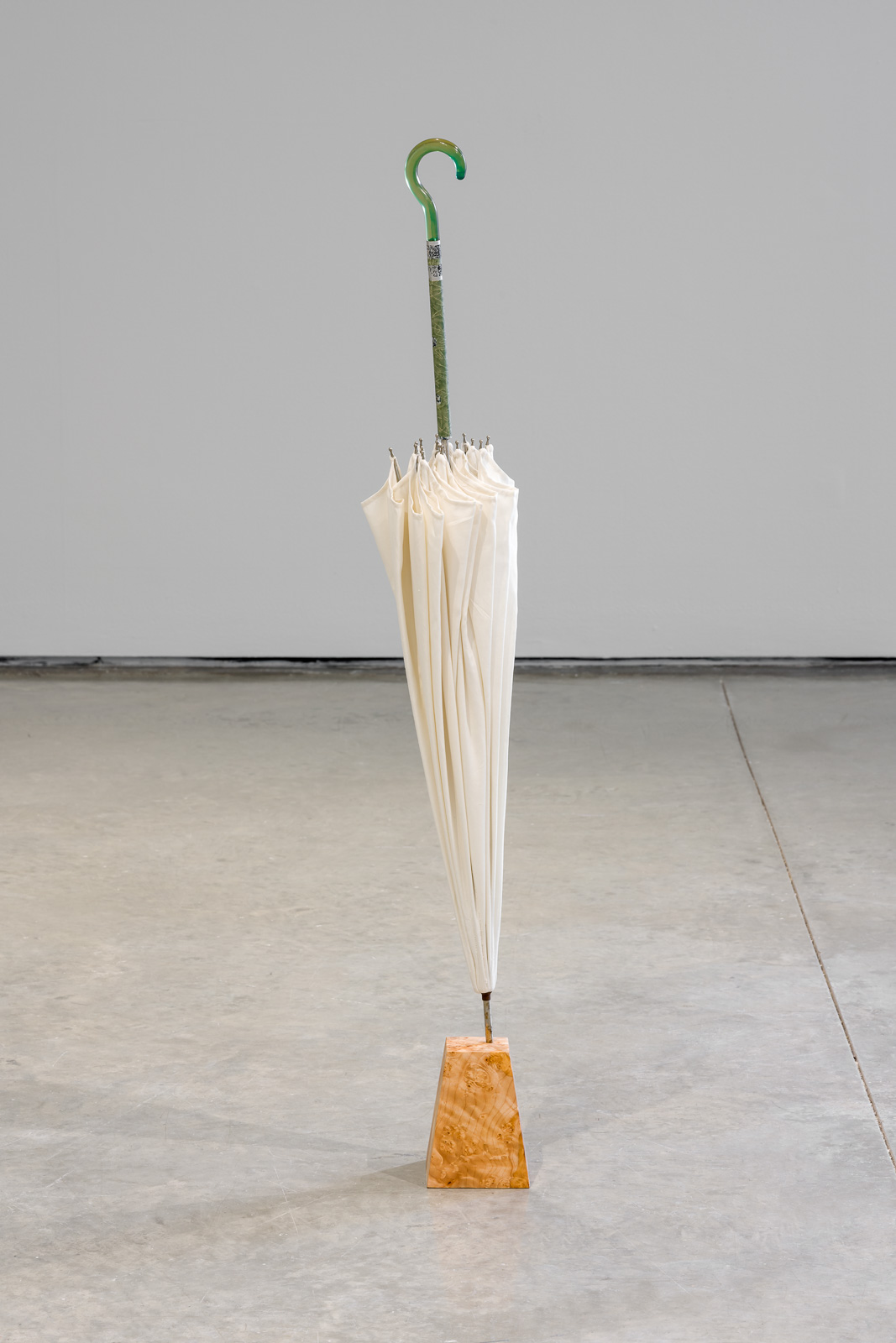 Handwoven silk, found plastic and metal components, wrapping paper, cottonwood burl