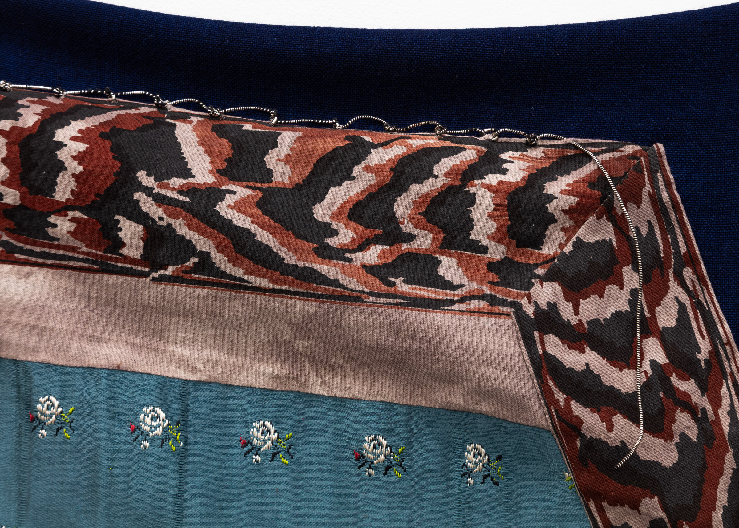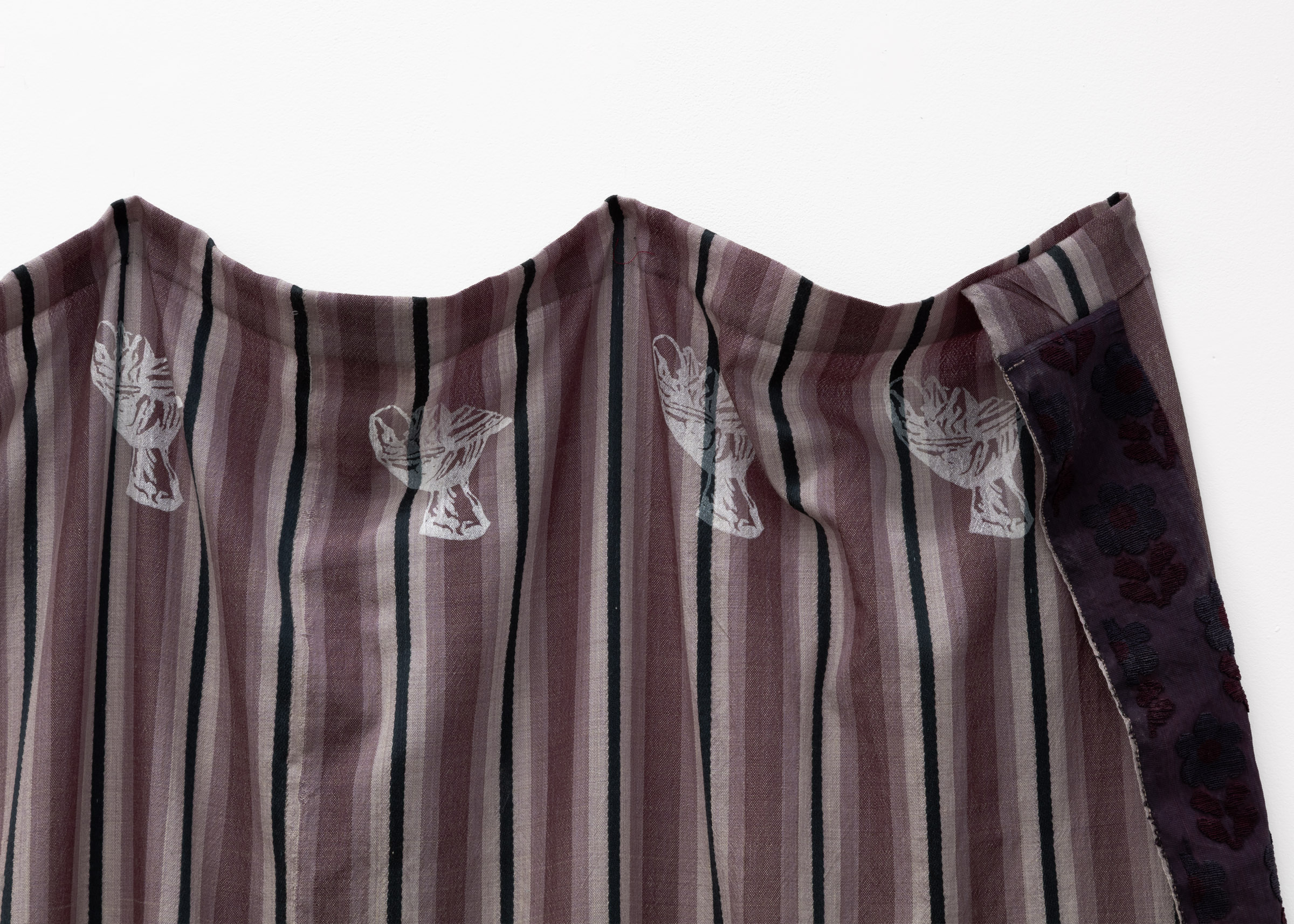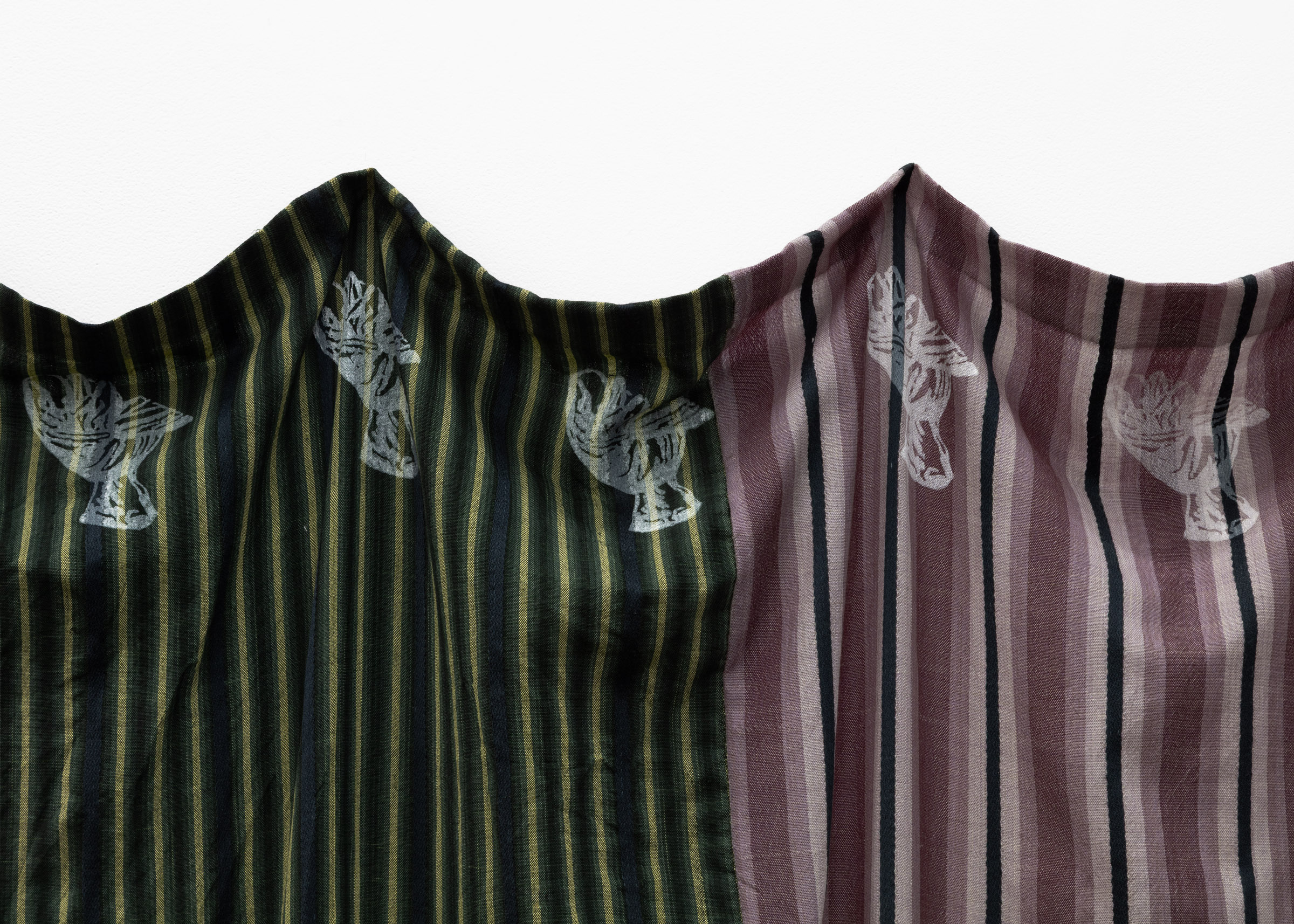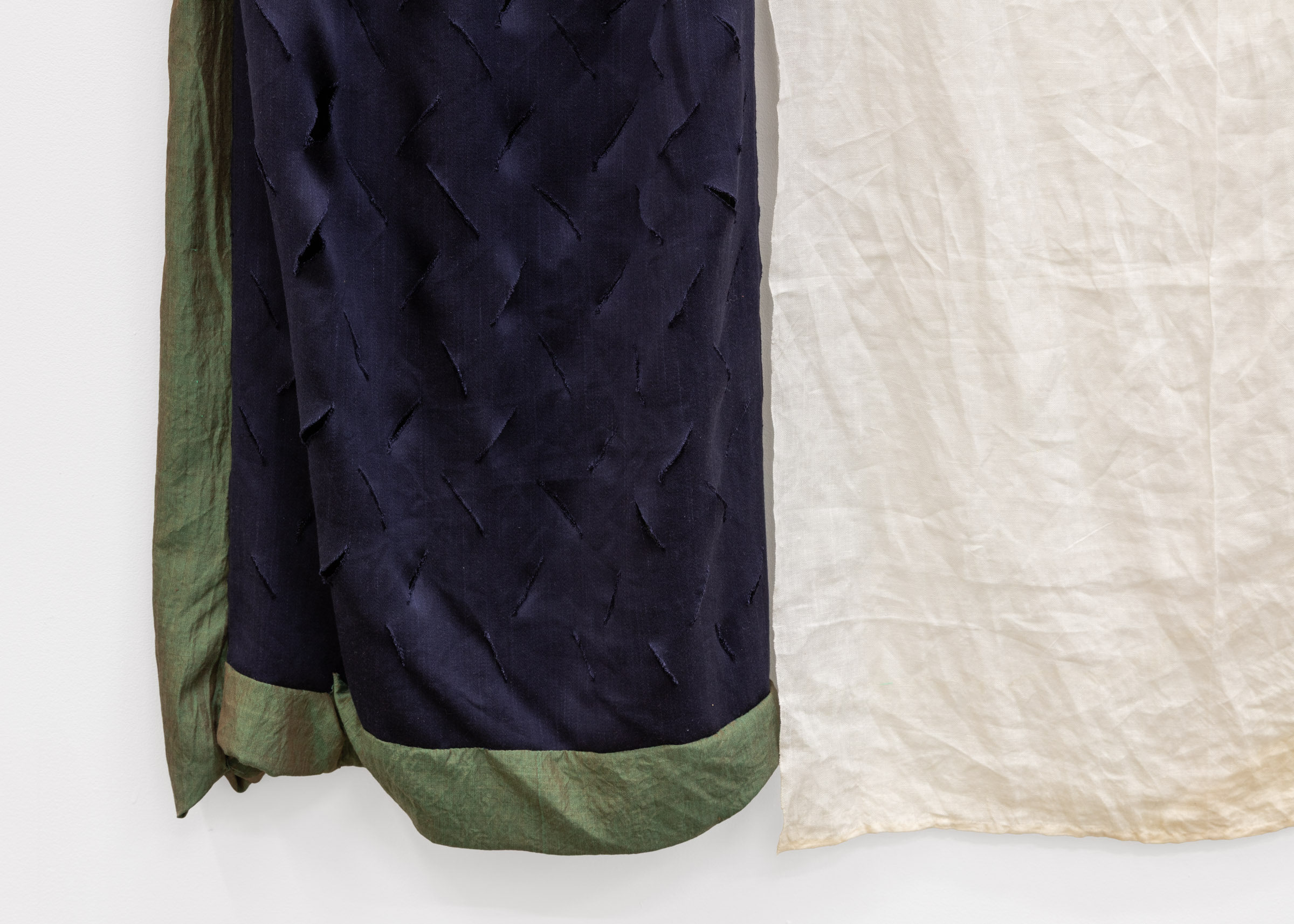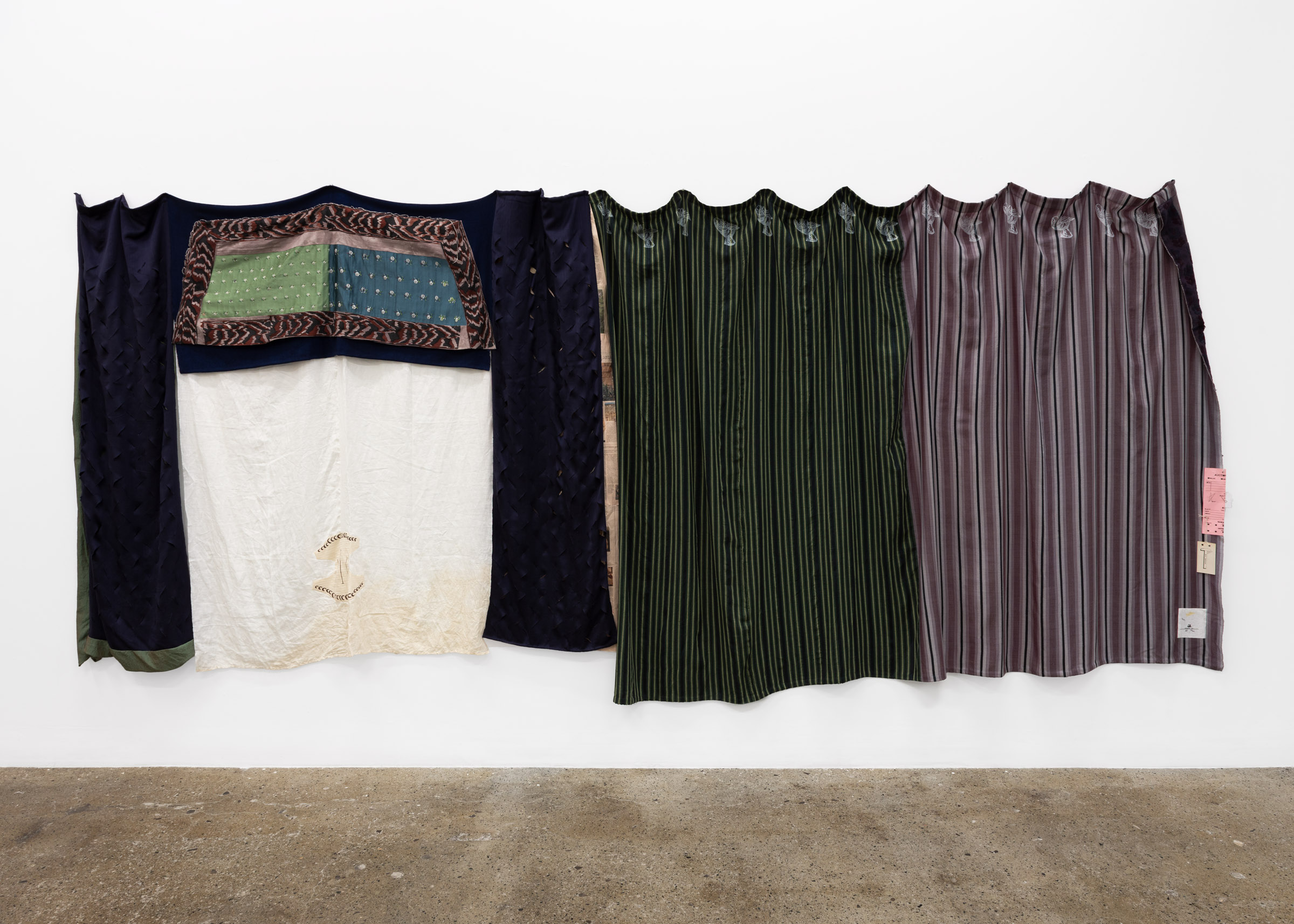 Screen print on hand woven and hand dyed spun silk and wool, hand woven linen, screen print on hand woven cotton, hand woven wool, hand woven spun silk,found newspaper, screen print on paper, found cord