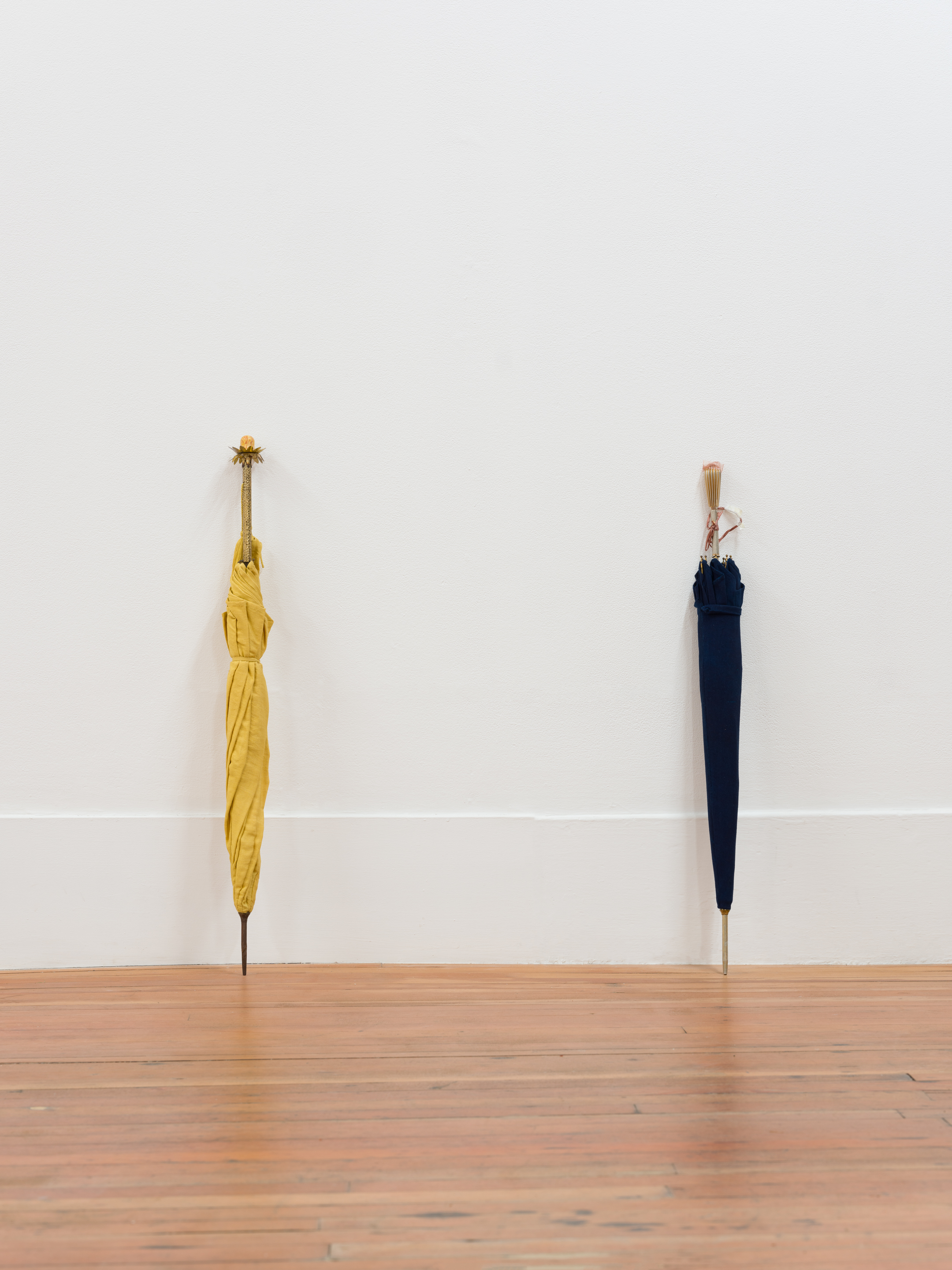Weld and fustic dyed spun silk, wood, paint, brass, found metal components