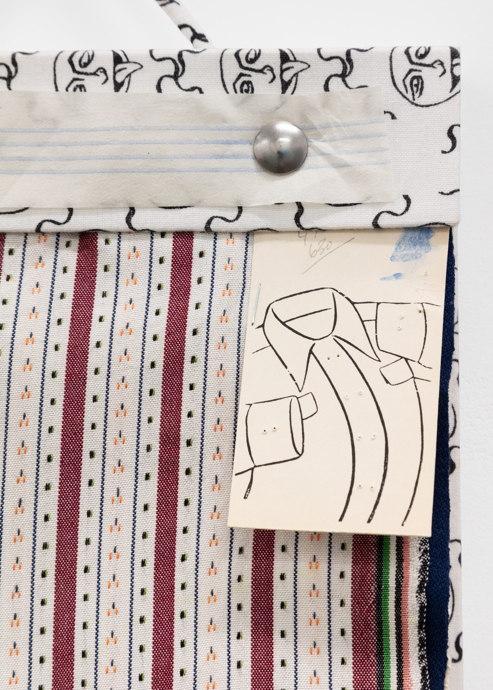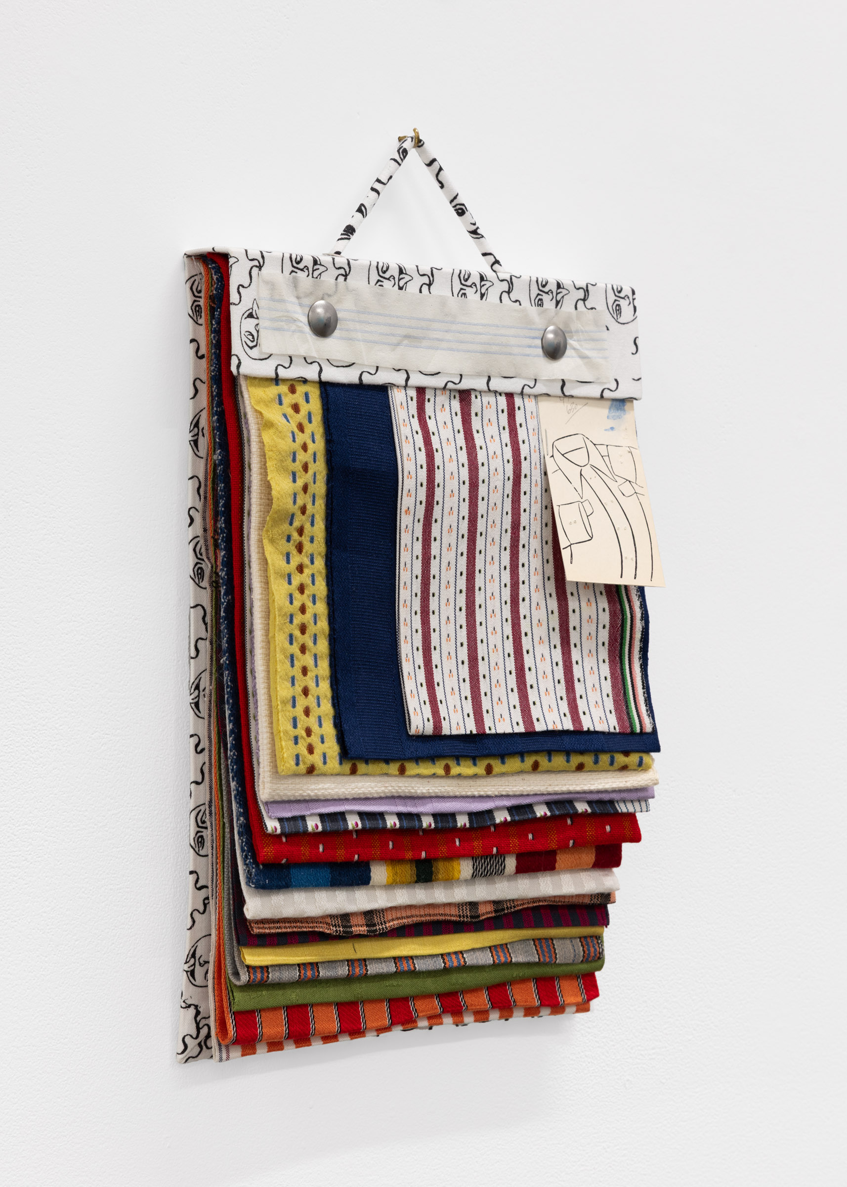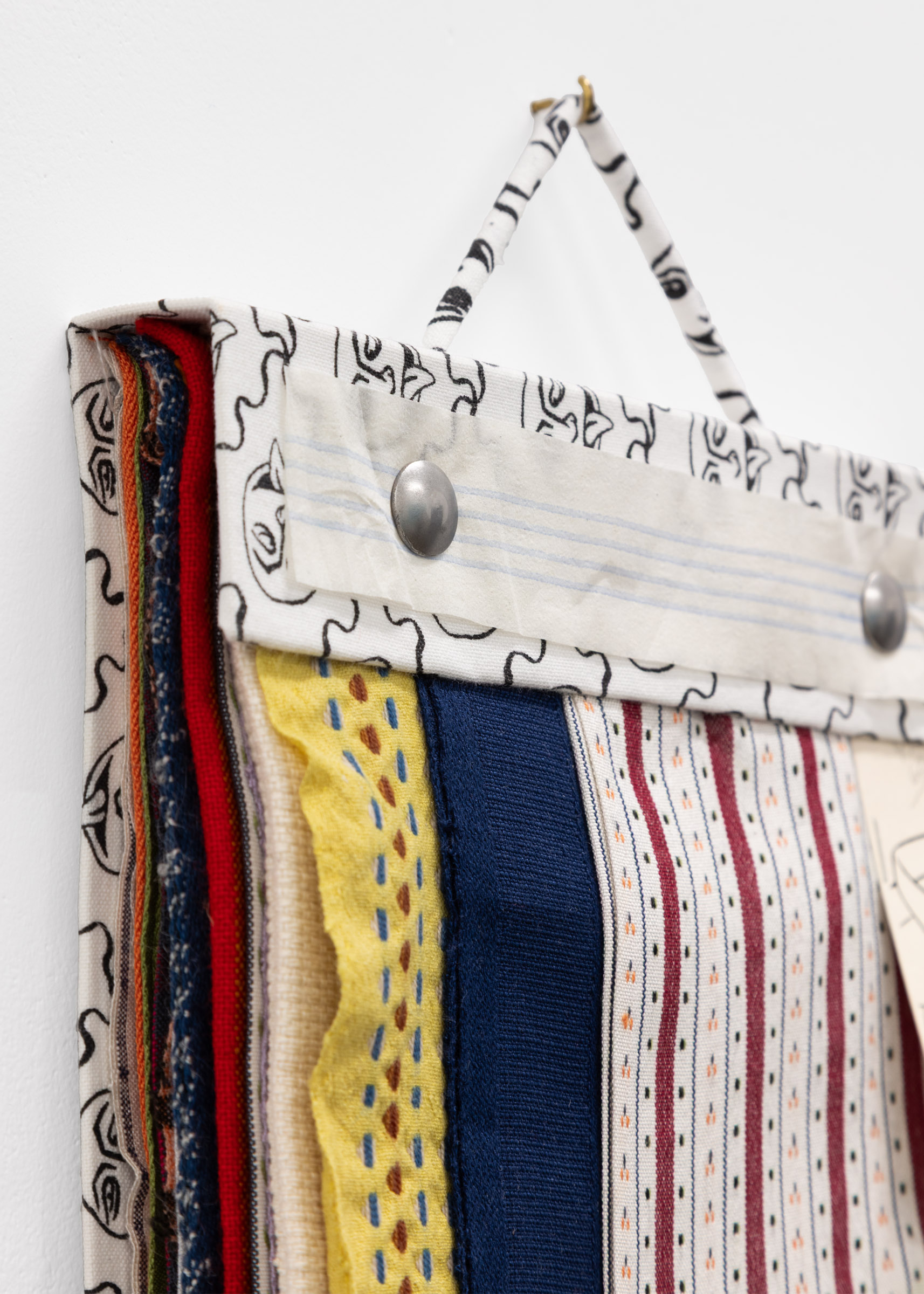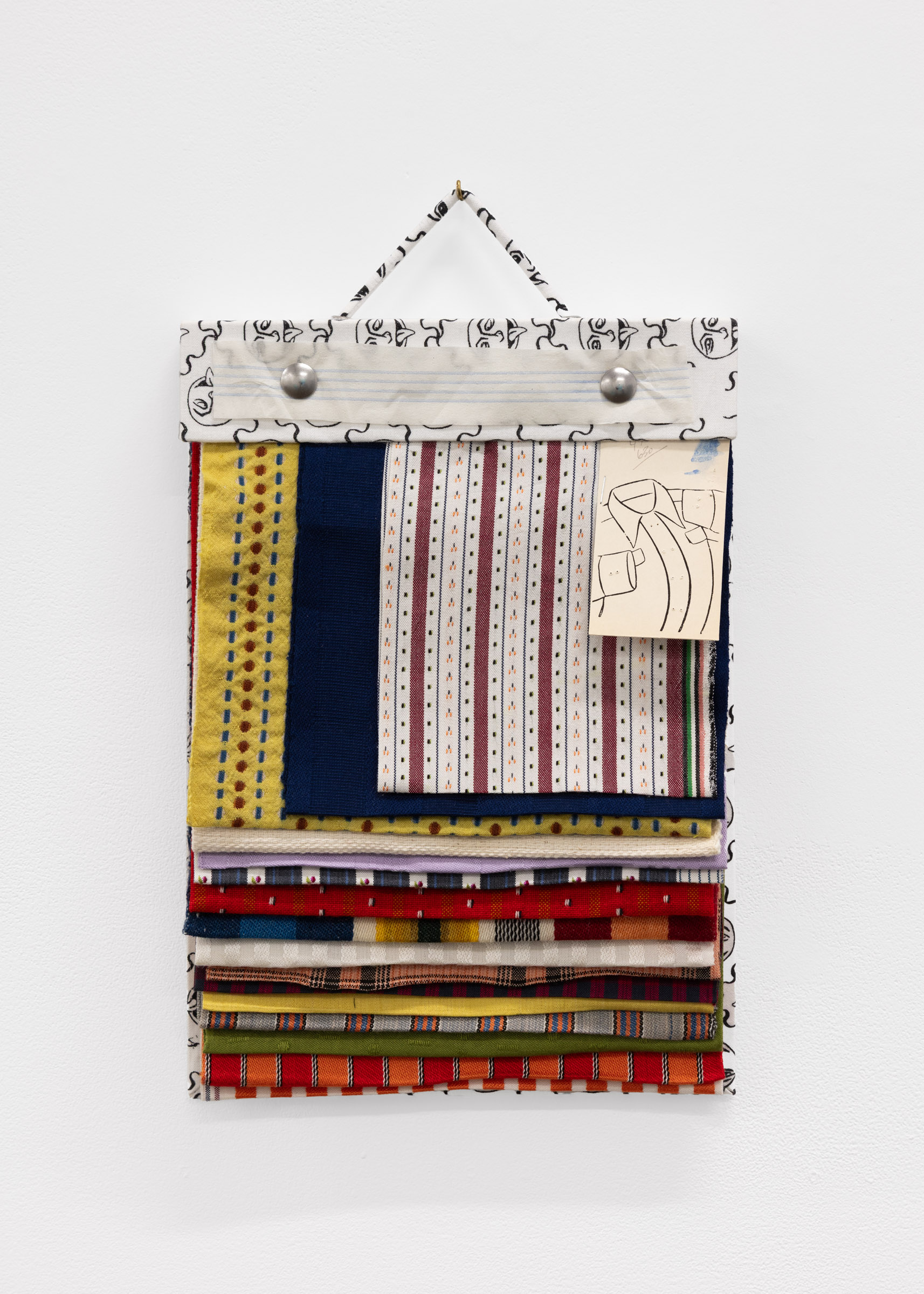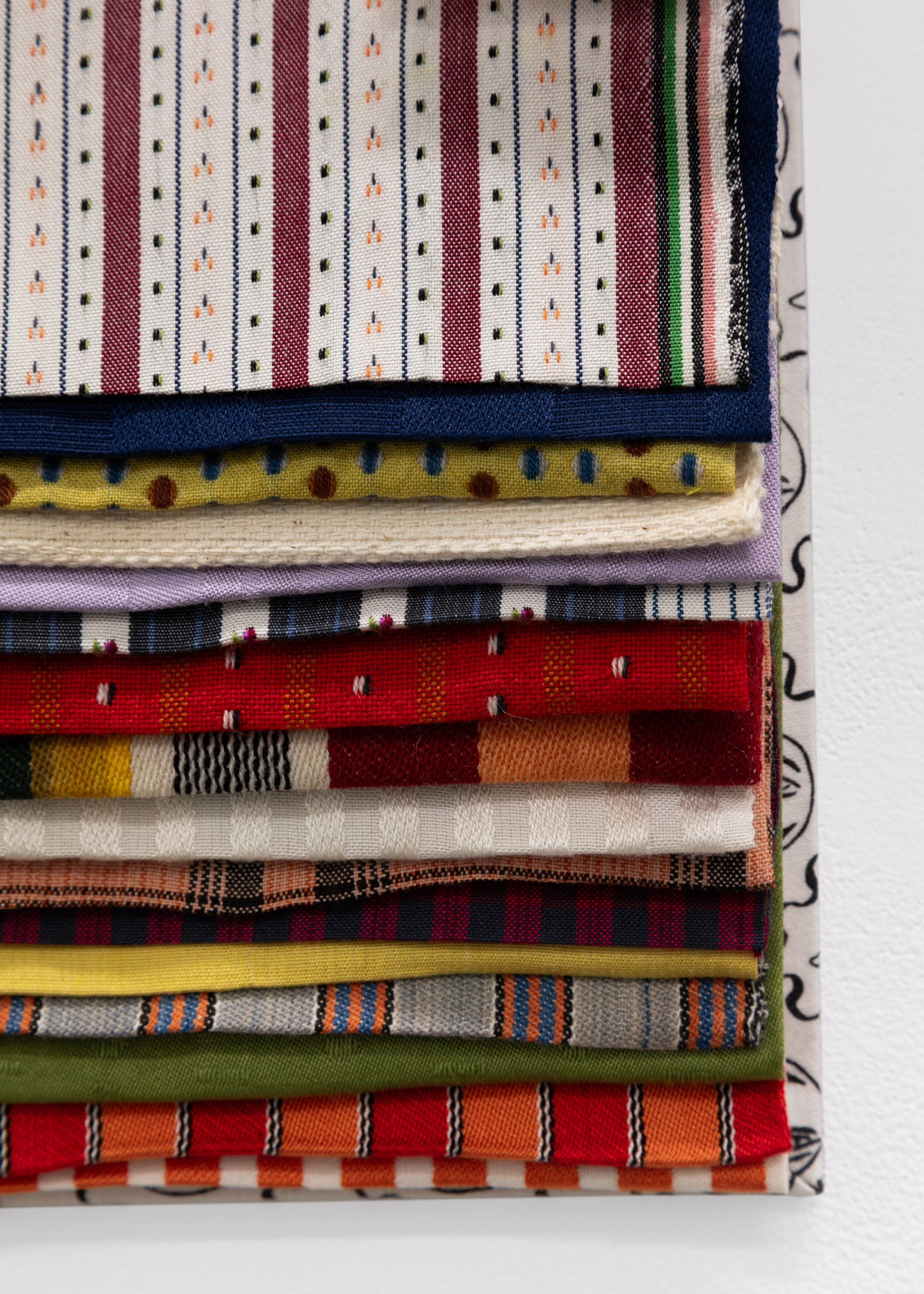 Hand dyed and hand woven cotton, silk and wool; screen print on cotton, screen print, watercolour and pencil on paper, metal