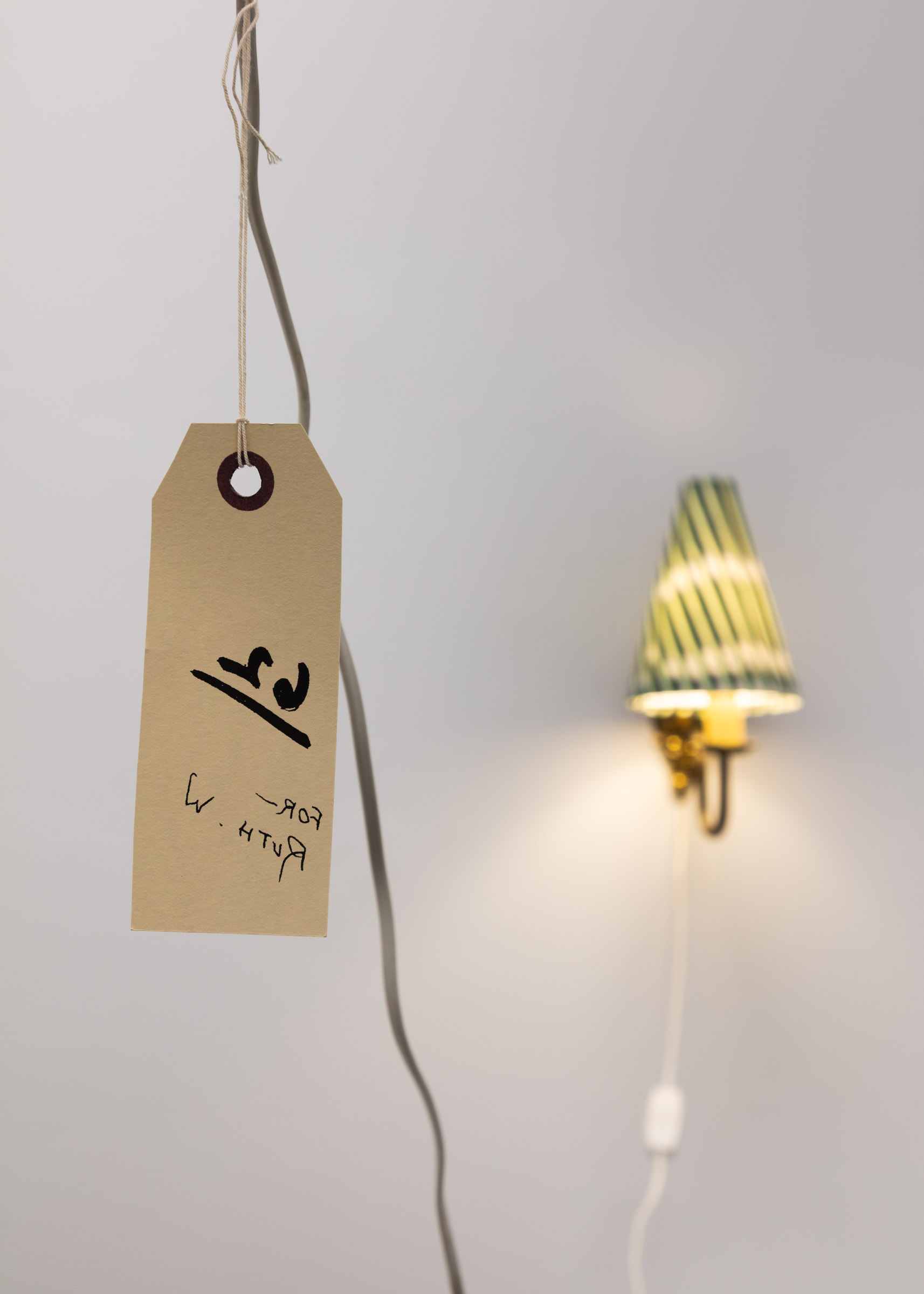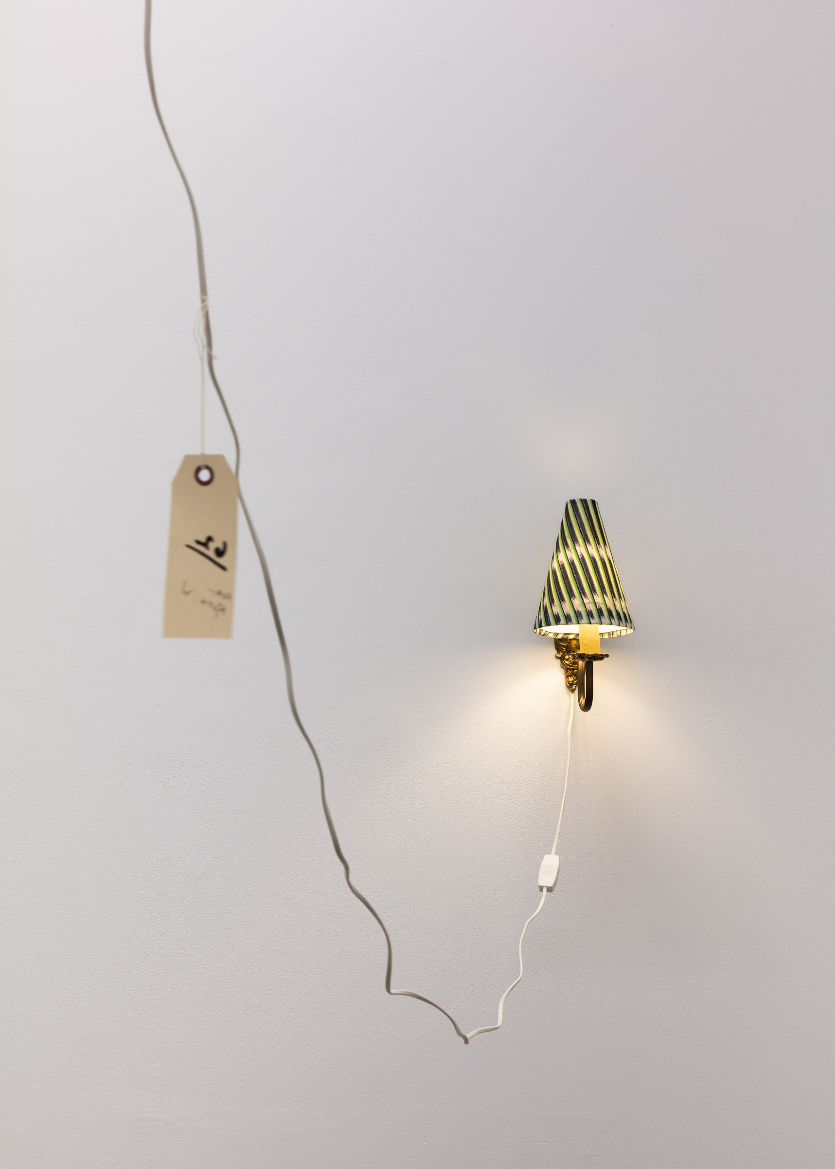 Hand dyed and hand woven silk, found lamp, silkscreen on paper, string